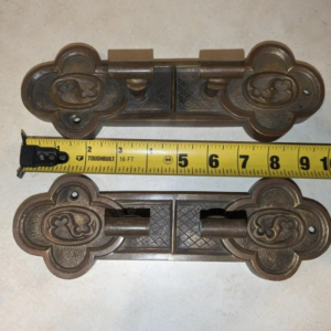 Found in an architectural salvage warehouse. Owner didn’t know what they were. Possibly old lighting? The screw holes don’t line up linearly, so I assume they don’t mount to a stud. They have a hollow piece on the back that seems like it would hang on a clip or a nail? 10″ long, 3 1/4″ wide. 5/8