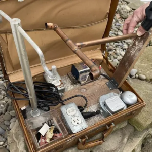 Found a locked briefcase under an old wood shed floor: Inside are power supplies / plugs, a 9V battery, alarm, removable piping and a removable bracket