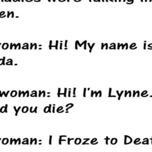 Two women were talking in Heaven. Hi, SyIvia! How’d you die?I froze to de ath. How horrible said the other woman! It wasn’t so bad repIied Sylvia….