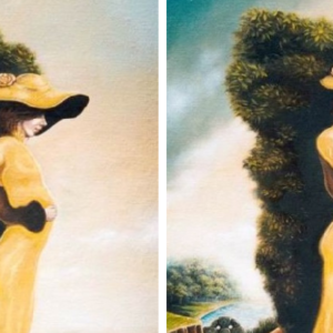 There is more than just one face in this optical illusion picture. The main character of this painting is a woman standing on a rocky surface. But…