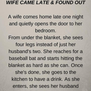 One late evening, a wife softly unlocks the door to her bedroom upon returning home. She can see four legs peeking out from under the cover. One…