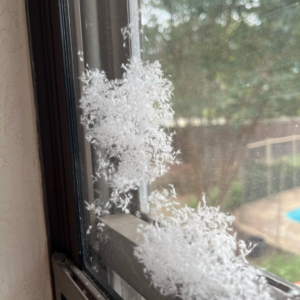 Wife thinks it may be a spider or something that built a nest but it looks almost like the pollen from a tree that has the fuzz attached to it.