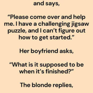 “Please come over and help me. I have a challenging jigsaw puzzle, and I can’t figure out how to get started.” Her boyfriend asks, “What is it…