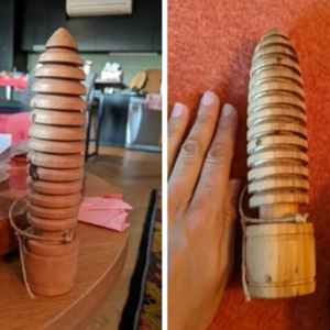 “An oblong wooden object with grooves and a hole in it. It came in a box with a grain mill but doesn’t belong to the machine. Do…