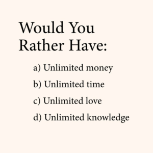 Life is full of difficult choices, but few are as thought-provoking as the classic question: Would you rather have unlimited money, unlimited time, unlimited love, or unlimited…