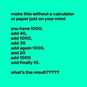 THE QUESTION THE ANSWER Starting with 1000, add 40, then 1000, followed by 30, another 1000, then 20, another 1000, and finally add 10. The total is:…