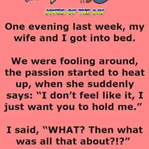 One evening last week, my wife and I got into bed. We were fooling around, the passion started to heat up, when she suddenly says: “I…
