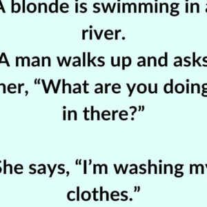 A blonde is swimming in a river. A man walks up and asks her, “What are you doing in there?” She says, “I’m washing my clothes.” The…