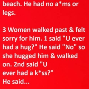 A man sat on a towel on a beach. He had no arms or legs. 3 Women walked past & felt sorry for him. 1 said “U…