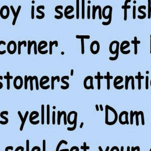 Someone going to work sees a crowd of people walking… A boy is selling fish on a corner. To get his customers’ attention, he is yelling, “Dam…