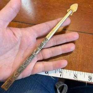 Metal item 7 & 1/4 inch long half inch wide at it’s widest point, with a flat spade shaped thing on one end, flat and hollow on the other, and a faded geometric design on the handle. Very light, found it in the heater grate probably dropped down there by a prior tenant