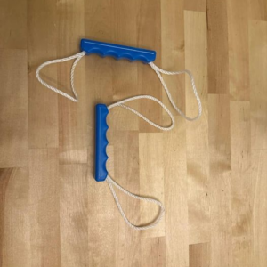 Blue plastic handles with finger grooves and white plastic rope loops at each end of the handle- handles seem hollow and don’t have much weight to them.