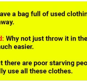 Wife: But there are poor, starving people who can really use all these clothes. Husband: Honey, anyone who fits into your clothing is not starving… 😀 A…