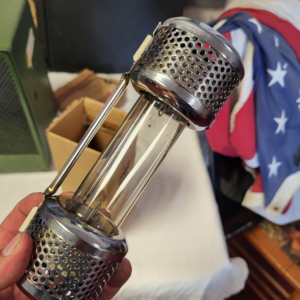 I picked this up at a thrift store, and the owner didn’t recognize it either. I’m pretty sure it’s aluminum and glass. It’s surprisingly light.