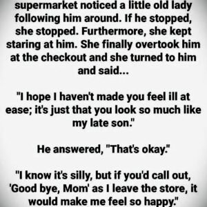 A Surprising Encounter at the Supermarket One day, while shopping at the local supermarket, a young man noticed a sweet little old lady trailing behind him. As…