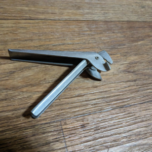 In an antique tool box, there was a hand tool with a cutting blade and a small metal lid that rotated.