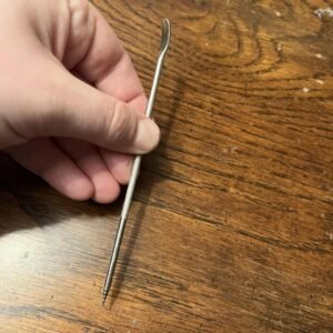 Slender metal dowel with a flattened, curved end and a pointed end.