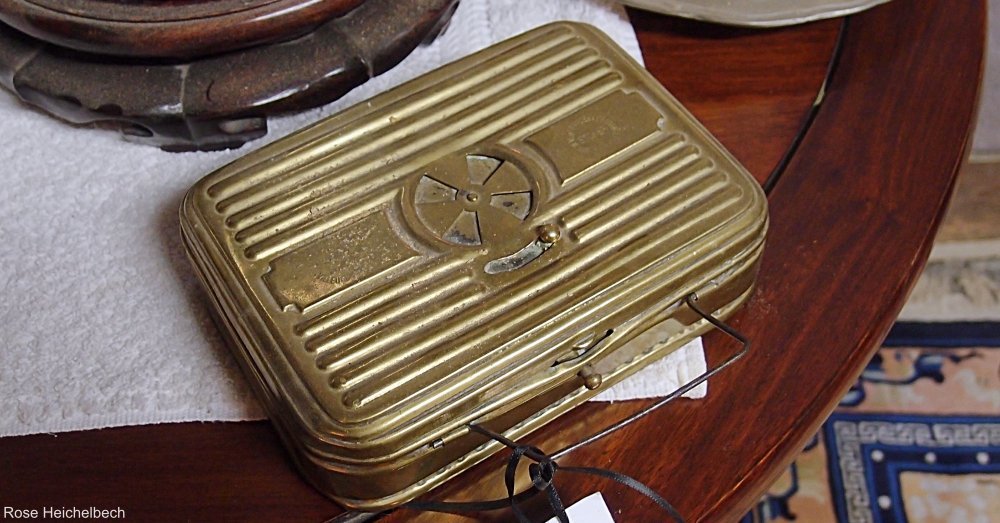 1) This brass box has a handle on the top and an adjustable vent on the front.
