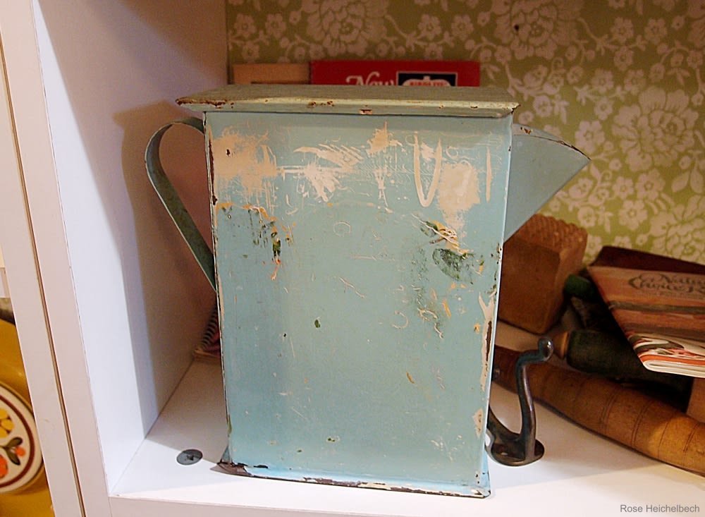 3) Next up we have a very beat up, aqua blue metal container with a spout on one side.