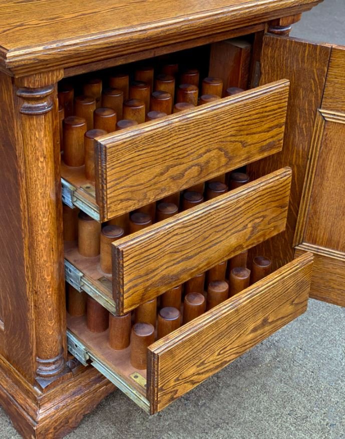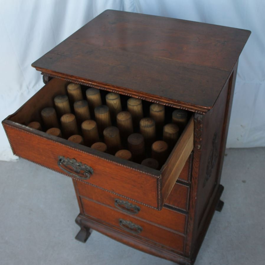 The antique oak cylinder record cabinet, designed for storing Edison phonograph cylinders, is a fascinating relic from the early days of recorded sound. These cabinets were not only functionally important but also among the first examples of home entertainment in the early 20th century.