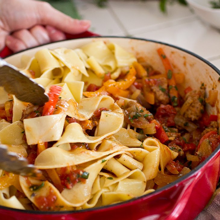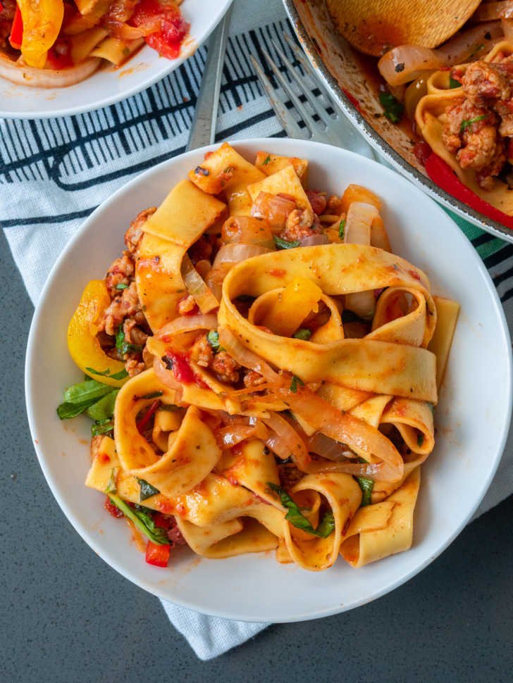 While you could technically use any type of pasta you want, this recipe calls for egg noodles. These soft, wide noodles lap up all the savory sauce making them the perfect choice for this dish. Fresh ingredients like chopped red, yellow, and orange peppers, as well as onion, basil, and parsley add some healthy ingredients but also some amazing flavor.