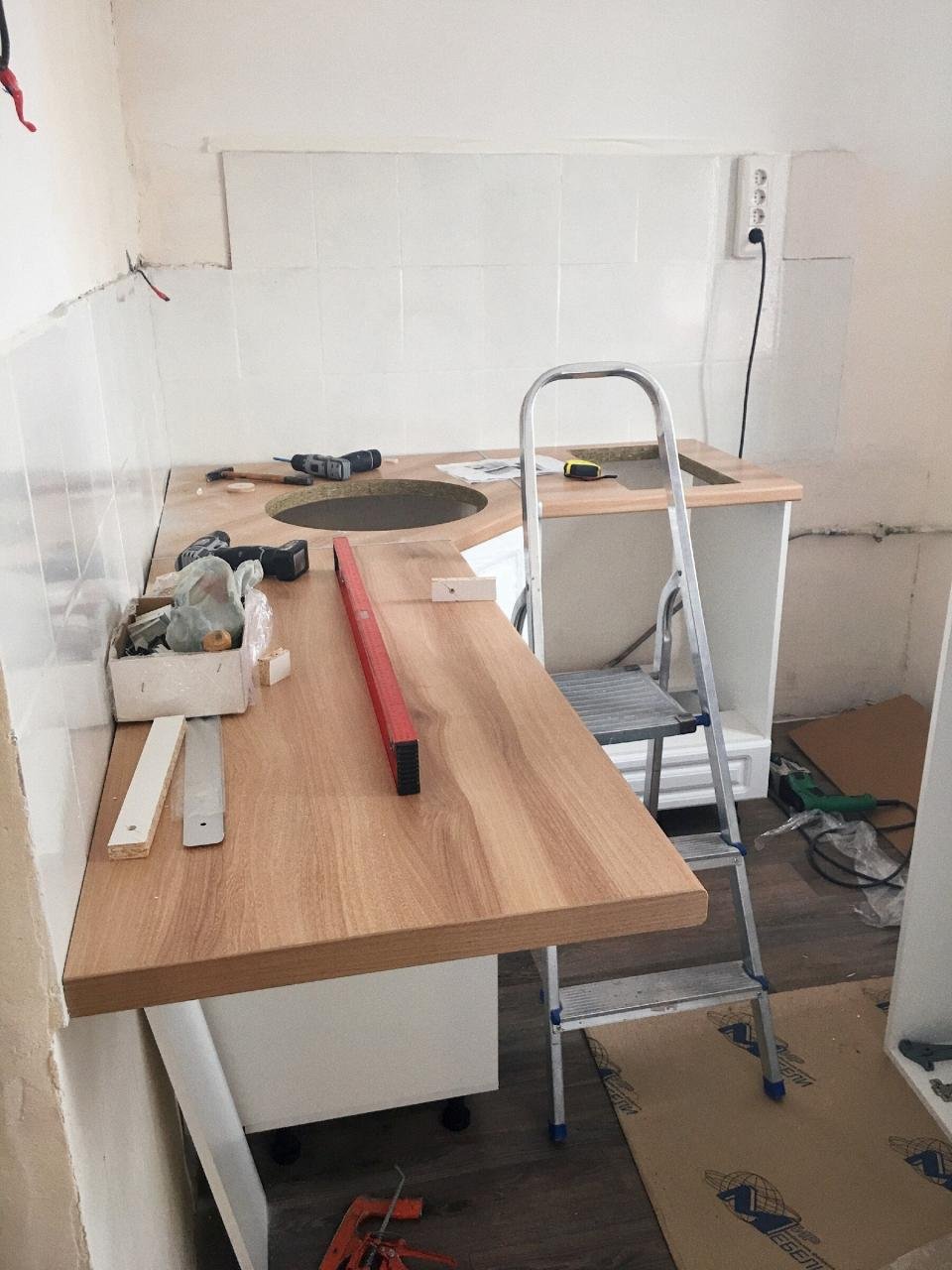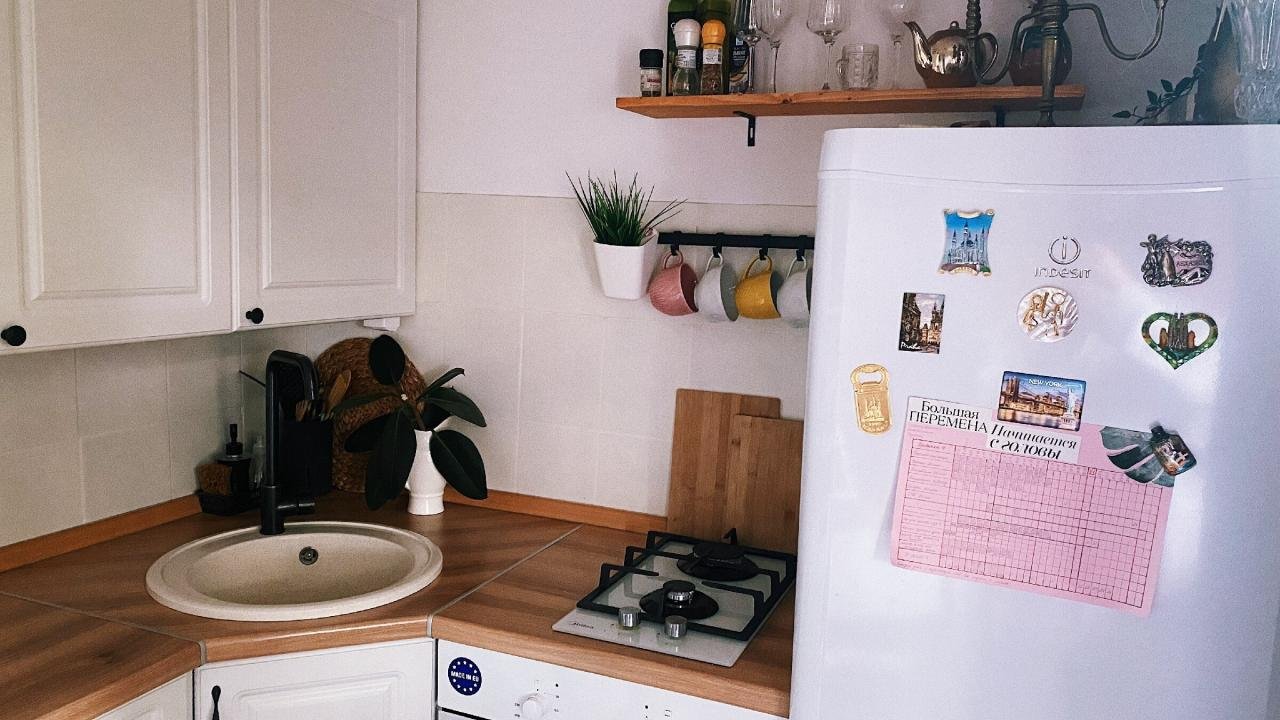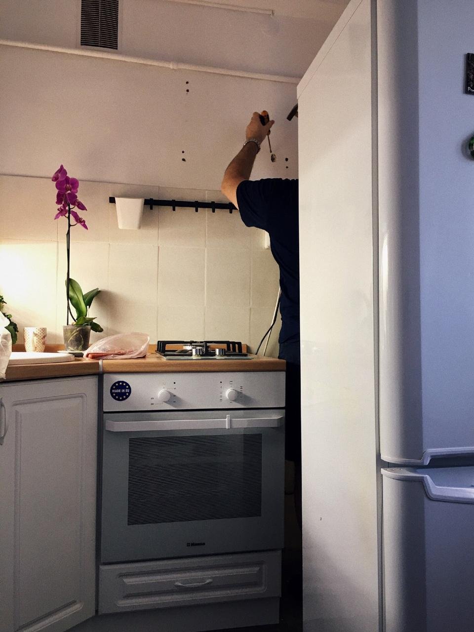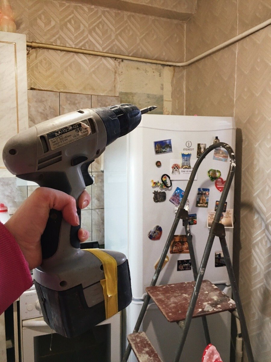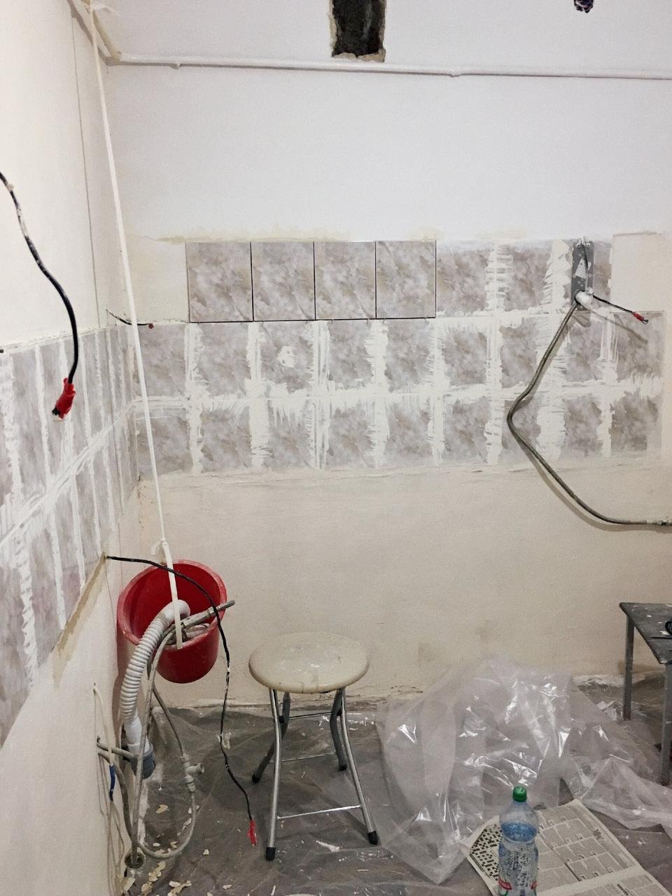 As you can see, the upper cabinets were crooked, but in the new version, I decided to remove them. There was a small issue – there weren’t enough tiles for the top row. However, the tiles were behind the refrigerator and not visible.