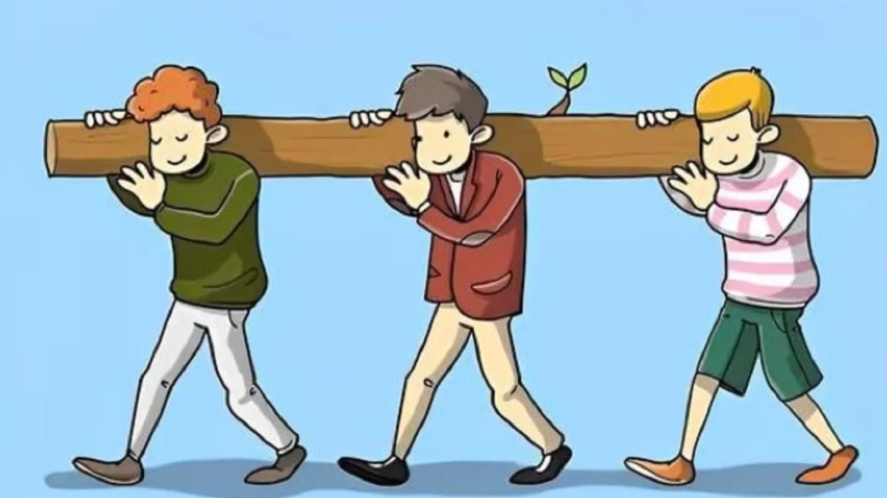 Today, we exclusively focus on your logical prowess in tackling the following visual test: three men depicted carrying a large log on their shoulders. Your task is to determine which of the three men bears the heaviest load.