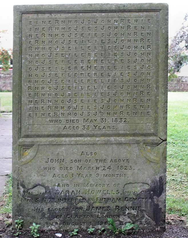 Amidst a pattern of capital Js and Rs, a solitary capital H marks the puzzle’s central block. From there, nearly 46,000 combinations emerge, spelling “Here lies John Renie.”